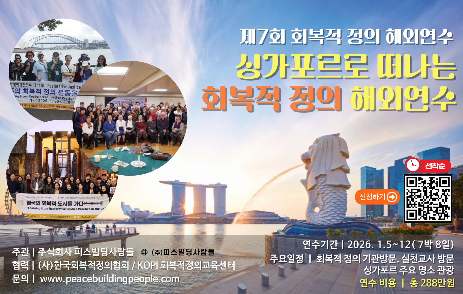 또한 배움만이 아니라 쉼과 교제의 시간도 준비되어 있습니다. 싱가포르의 세계적인 관광명소와 다채로운 문화가 살아있는 야시장 등을 함께 누리며, 여행을 통한 기쁨과 풍성한 영감을 얻을 수 있습니다. 무엇보다 이번 해외연수는 한국회복적정의협회와 KOPI를 통해 꾸준히 회복적 정의 운동에 앞장서 온 이재영 대표가 참가자들을 안내하고 통역을 맡아 줄 예정입니다. 이를 통해서 단순한 여행의 편의를 넘어, 현지에서의 배움과 만남이 더욱 깊어지고 풍성해지는 귀한 길잡이가 될 것입니다. 그리고 함께 하는 참가자들 간의 격의 없는 대화와 친밀한 사귐 속에서 함께 배우고, 나누고, 쉬며, 회복적정의 실천가로서의 미래를 함께 그려가는 시간이 될 것입니다.
